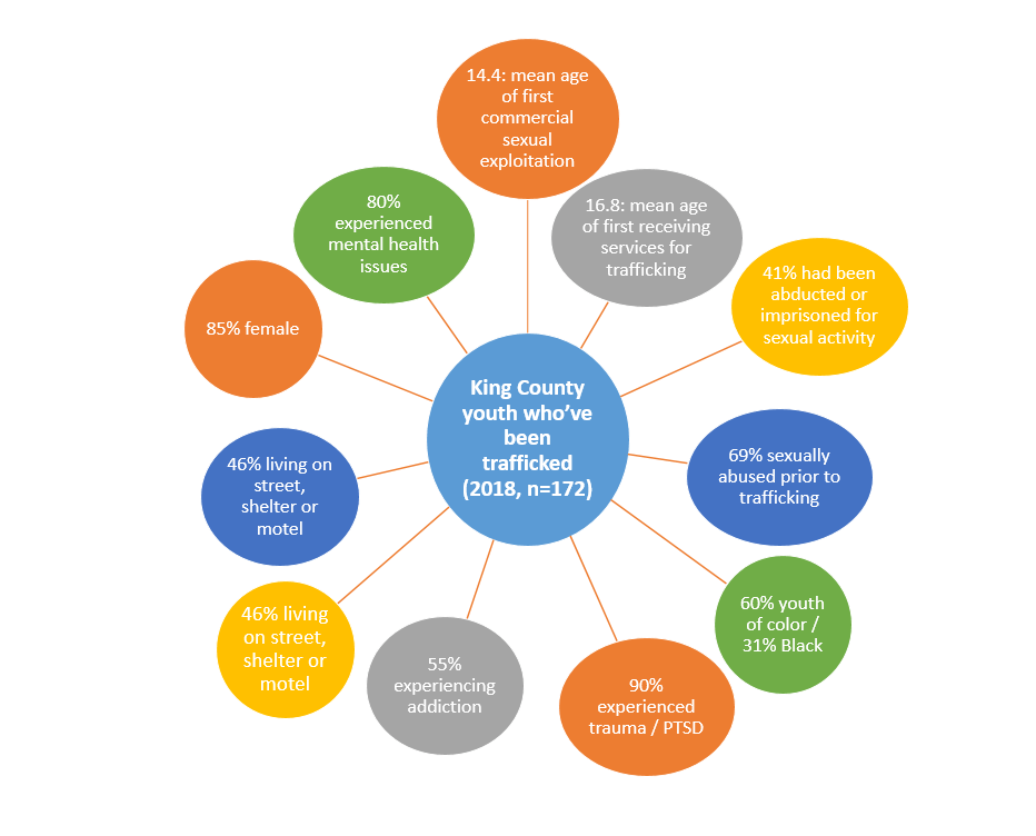 In 2019, advocacy group StolenYouth published a study including demographics of King County youth receiving services for experiencing commercial sexual exploitation.